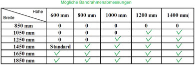 Sonderbogenmaße auf Anfrage erhältlich (siehe Tabelle für Sondermaße)
